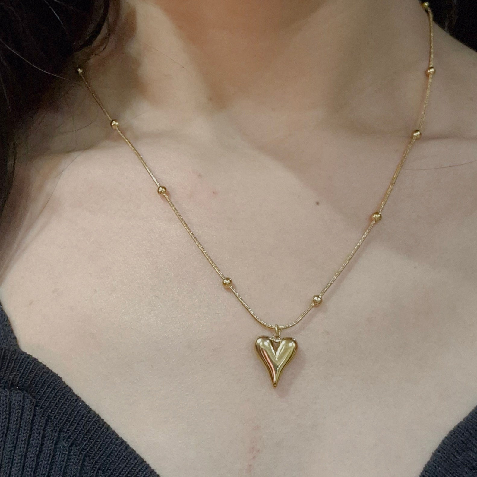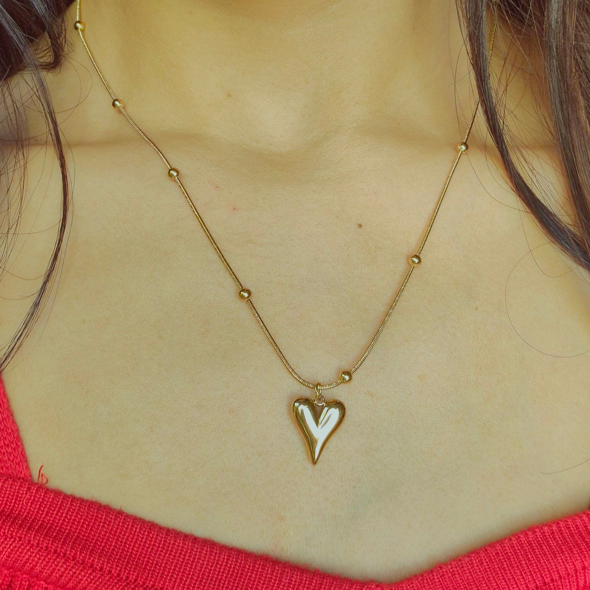 Soft, romantic, and effortlessly elegant. This heart‑shaped pendant is designed to sit close to your heart and elevate your everyday style. The smooth, puffed gold heart paired with a delicate beaded chain gives this piece a premium, feminine feel that works beautifully for daily wear, dates, and gifting.